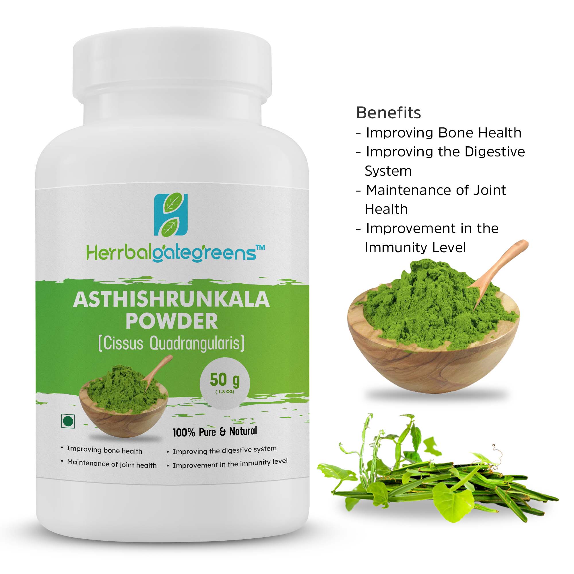 Asthishrunkala  is also known as Cissus quadrangularis  and is considered as an effective joints care supplement. This joints relief powder is a rich source of various nutrients to maintain joints health in a natural way. However, this cissus powder may contain ascorbic acid, beta-amyrin, beta-carotene, beta-sitosterol, calcium etc. Additionally, Cissus quadrangularis powder may also contain carotene, Vitamin, carotenoids, iridoids etc. to maintain the joint health. Asthishrunkala  is a great energy booster and an amazing dietary supplement to relieve stress & depression. Good for the skin, as it prevents aging and reduces fine lines. Cissus Quadrangularis works to foster proper bone cell growth, regeneration and proliferation, thereby ensuring good structural development of the Body. These benefits and medicinal values are mentioned in many Government approved Siddha Medical books